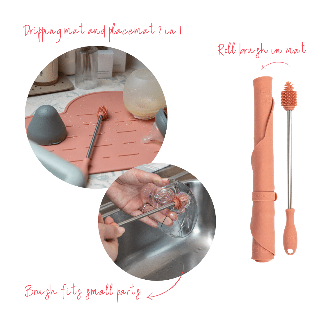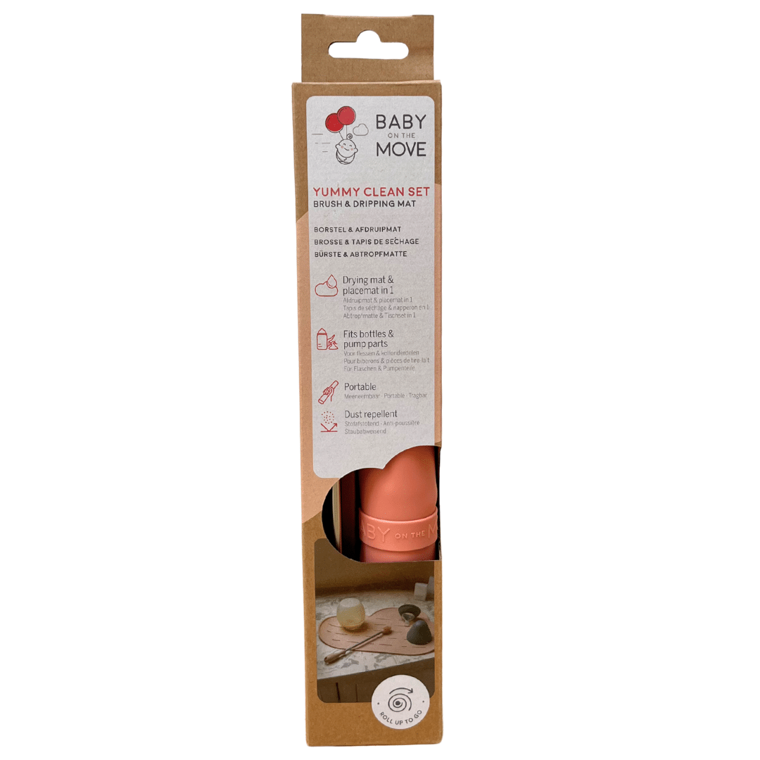 Our Owego Yummy Clean Set makes cleaning bottles, breast pump parts and other Yummy products a breeze, even when you’re on the go! The brush is designed for those tricky little parts, while the mat provides the perfect clean surface for drying. Plus, you can also use the mat as a placemat for your little one, perfect for messy eaters!