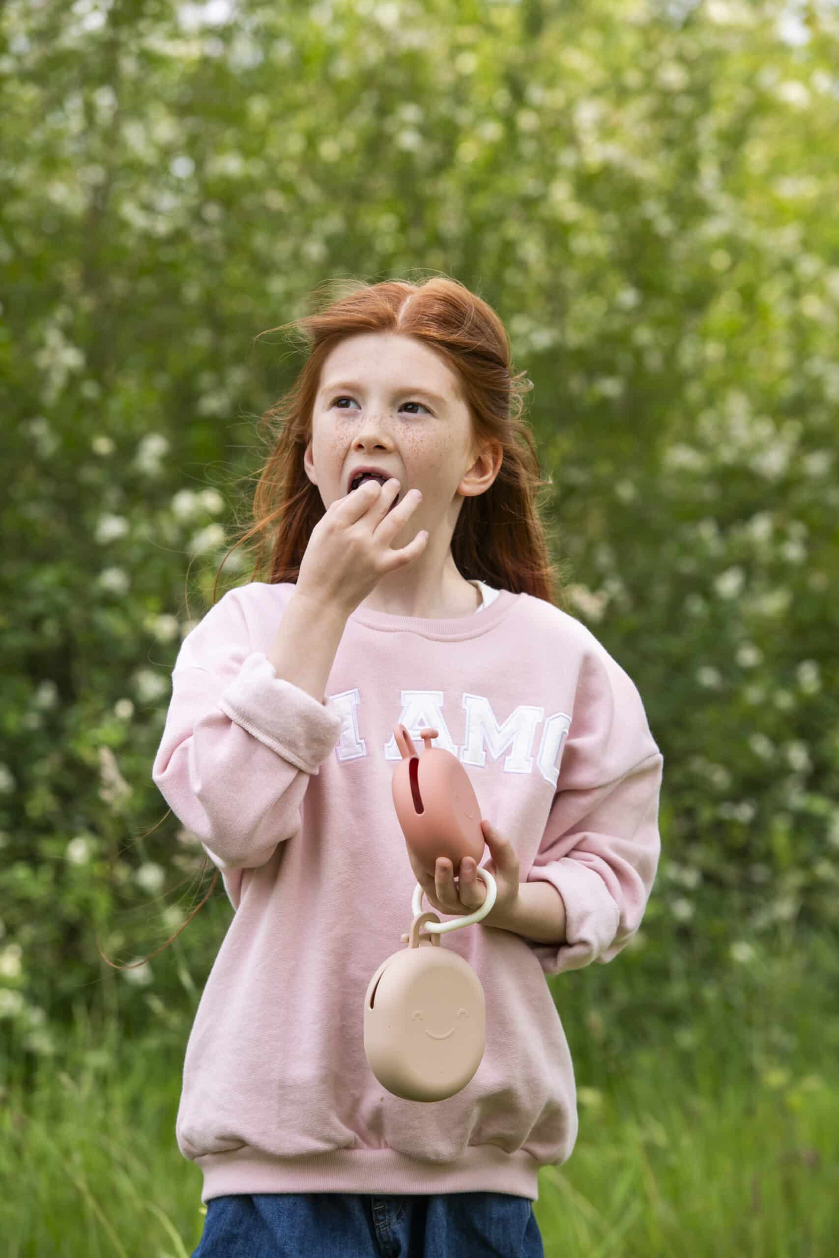 Ik dacht eerst: dit doosje is niet afsluitbaar, dus hoe handig kan het zijn? Maar mijn dochter vond het fantastisch om er met haar handjes in te graaien. Ik vul het nu met kleine rijstkoekjes en hang het gewoon aan mijn handtas of buggy. Zelfs op de fiets kan ik er makkelijk bij.