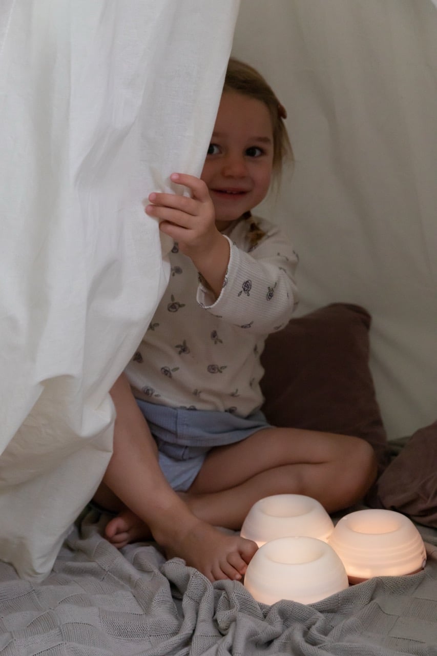 Ongeveer een uur voor het slapengaan doen we het thuis rustiger aan, dimmen we de lichten, verlagen we de energie en zetten we de schermen uit. We sluiten ook al de verduisterende gordijnen, zelfs als het buiten nog licht is. Het is een kleine verandering die tegen hun kleine lichaampjes zegt: “Het is tijd om tot rust te komen”.